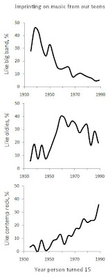 People who were 15 in the late '30s like big band music the most, while those who turned 15 around 1960 like oldies the most, and those who turned 15 in 1989 like contemporary rock the most. "Contemporary rock" in 1993 likely meant alternative rock. In all cases, the year when the music style peaked is the year when its greatest fans were 15. This isn't so clear in the contemporary rock graph since alternative rock peaked around 1994, so that those who were 15 then were not covered by the survey. You can tell, though, that it's still going up in popularity after 1990.