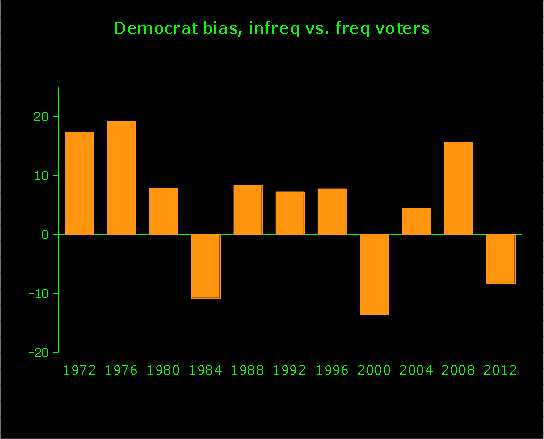 For example, in 1972 the frequent voters went 35% for the Democrat, while the infrequent voters went 52%, for a difference of 17 points favoring the Democrat among the infrequents. The graph below shows how Democrat-biased the infrequent voters were, compared to the frequents, where negative values mean they were Republican-biased compared to the frequents.