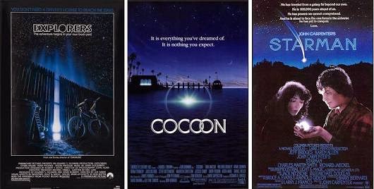 This looks pleasantly familiar. Brilliant rays of light reaching planet Earth far from off in outer space, in the dead of night to heighten the bright-dark contrast, and with the humble world down below unprepared for its imminent encounter with the Sublime. These elements formed the framework for just about every movie poster from the '80s that involved space travel and interaction between us and the outsiders. Have a look: