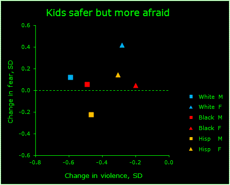 The males (squares) cluster off to the left, where violence levels have plummeted further and kids are only a bit more fearful than before. The females (triangles) cluster to the right, where violence hasn't plummeted by as much (since it was so low to begin with), and kids are more fearful than before — particularly for white females. There's no overall pattern for where the different races lie within the clusters. (Remember these are changes over time, not absolute levels, which do show race differences.)